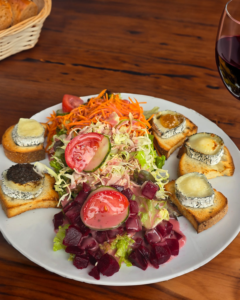 Variation de salades, jambon cru, sauce italienne. Toast (possibilité sans gluten) de chèvre aux différents arômes