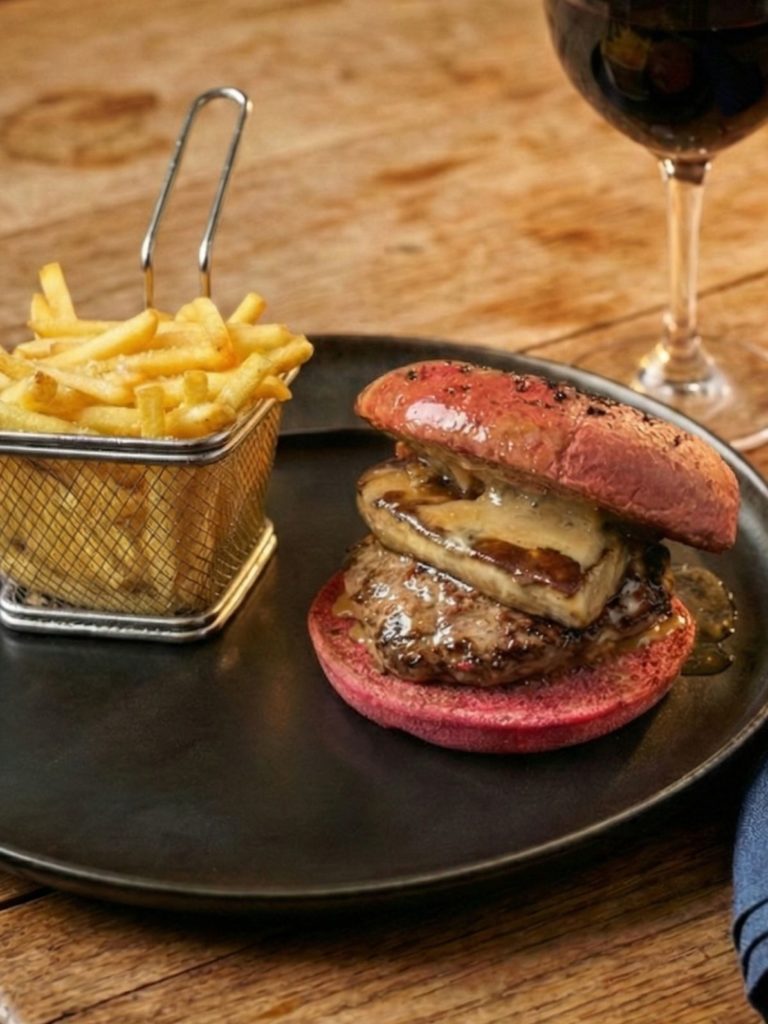 Pain bun red (rouge), steak haché, lard, sauce cocktail, fromage de chèvre, oignons confits, tomates séchées. Pommes frites et salade
