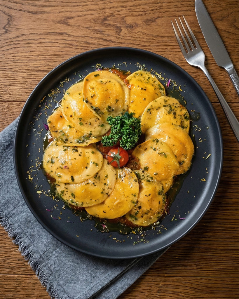 Pâtes fraîches farcies au homard, sautées au beurre aux herbes, servies sur un lit de coulis de tomates.